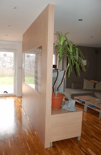 Ker je vhodni prostor dovolj velik (dnevna soba), je na njegovo sredino postavljen omarni korpus, delno zaprt s predali, delno (na vrhu) pa odprt z odlagalnimi policami.