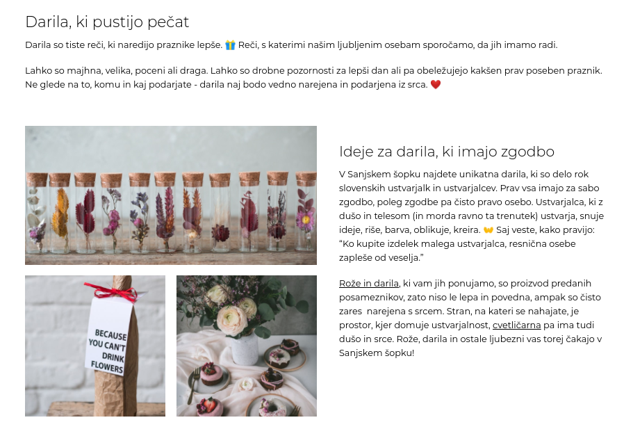 Če si boste ogledali njihovo spletno stran, kjer so predstavljena njihova darila, boste opazili, da se za razliko od ostalih prodajaln daril, Sanjski-Sopek.si, diferenciira s svojo ponudbo daril na način, da te povezuje z vsemi mogočimi kombinacijami rož in šopkov.
