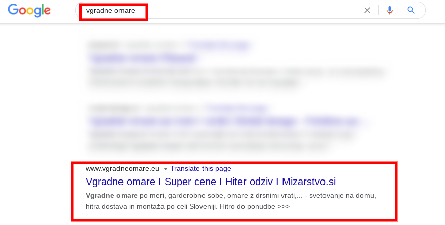 Če boste brskali za vgradnimi omarami po Googlu, boste opazili, da se spletna stran vgradneomare.eu, med neplačanimi prikazi spletnih strani, na Googlu, nahaja kar na tretjem mestu, na prvi strani, Googla: